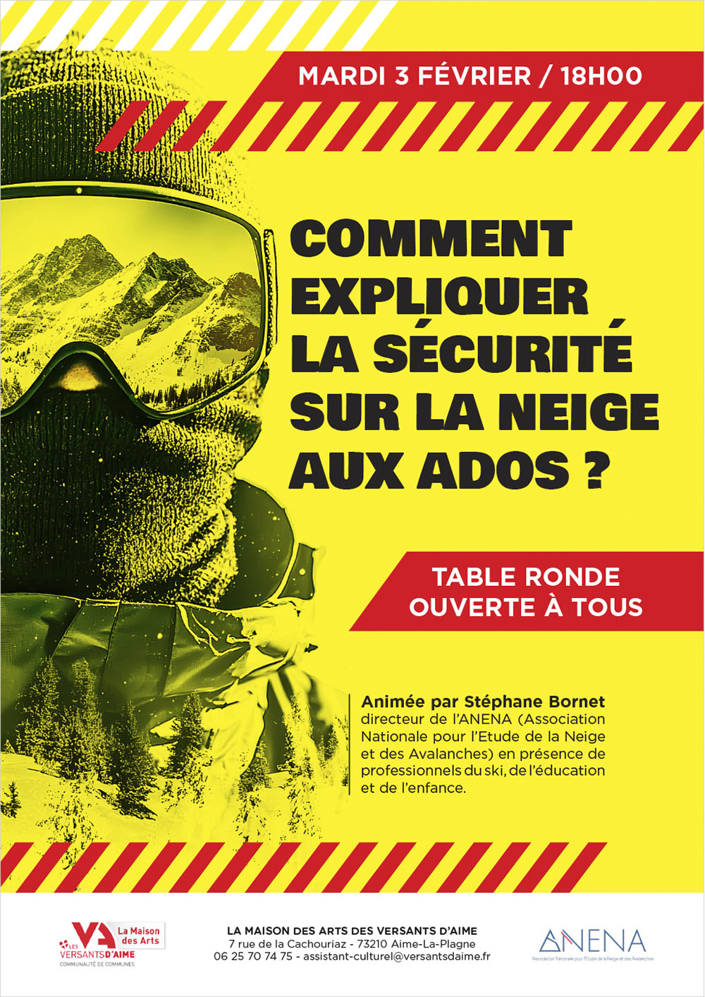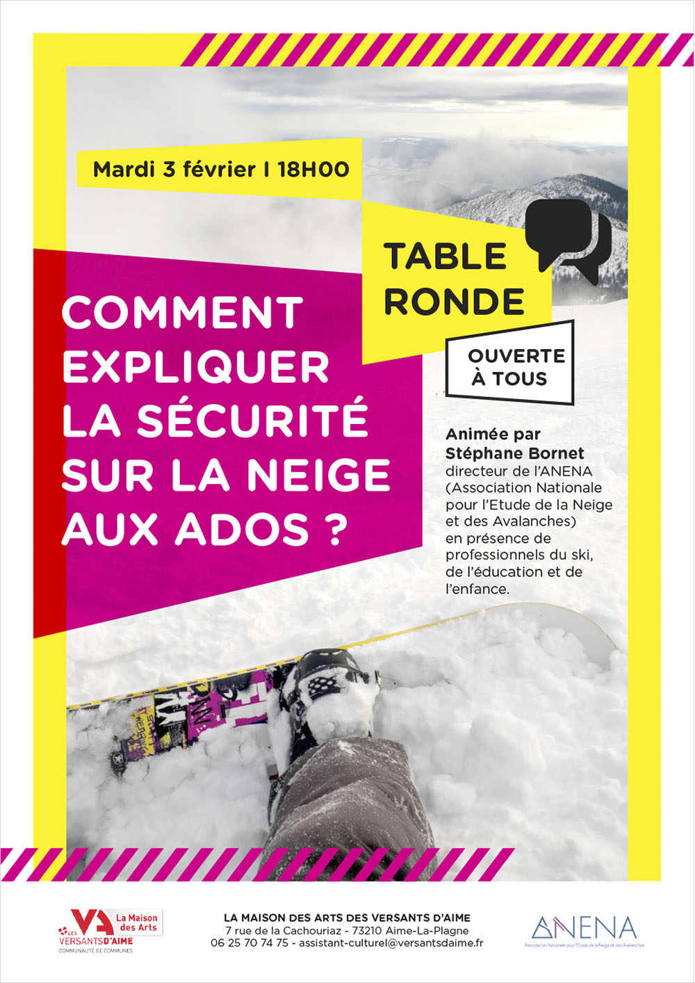 Le responsable de la Maison des Arts des Versants d’Aime me contacte pour réaliser une affiche pour l’annonce d’une table ronde autour de la sécurité des adolescents en montagne.
